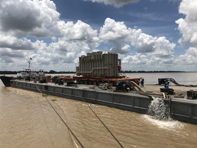 Giai đoạn 4 – đổ bộ hàng lên bờ (load-in) và trung chuyển về bệ máy: Đây là giai đoạn mấu chốt quyết định sự thành công của công trình. Khi điều kiện thuỷ triều cho phép, sà lan sẽ cập cảng công trường để lắp đặt cầu dẫn, bơm giằng ổn định, cân bằng sà lan và tiến hành tháo tăng đơ chằng buộc giữa hàng với sà lan. Tại thời điểm phù hợp, qua bộ điều khiển không dây, rơ-mooc tự hành sẽ vận chuyển máy biến áp lên bờ thông qua hệ thống cầu dẫn và tiếp tục trung chuyển vào bệ vận hành theo tuyến đường đã được kiểm tra, khảo sát trước đó.
