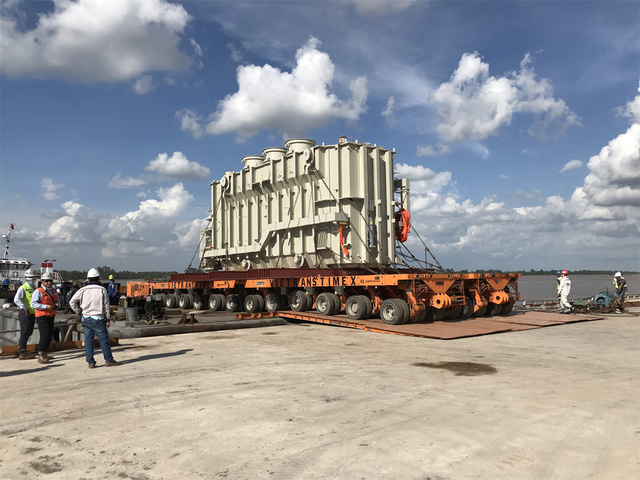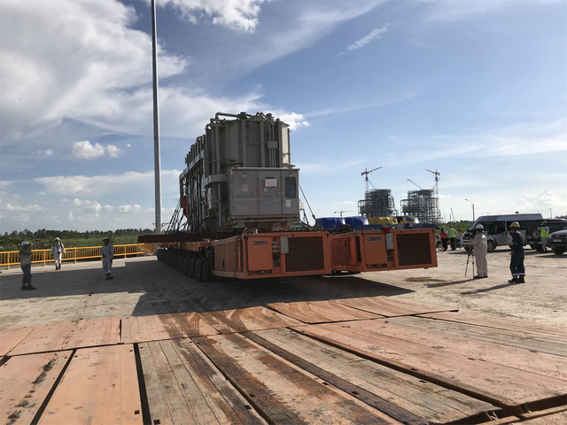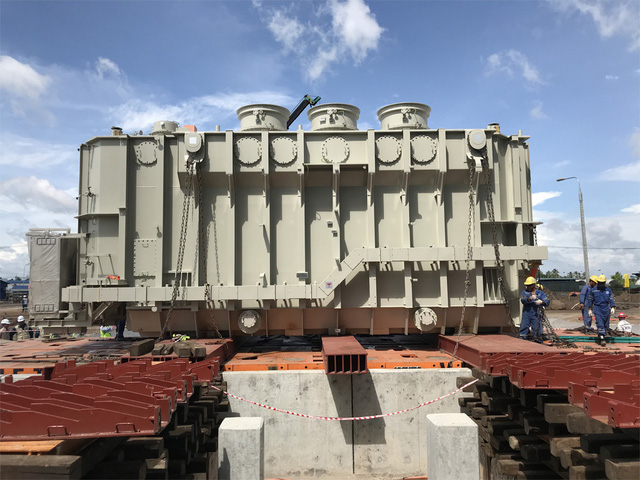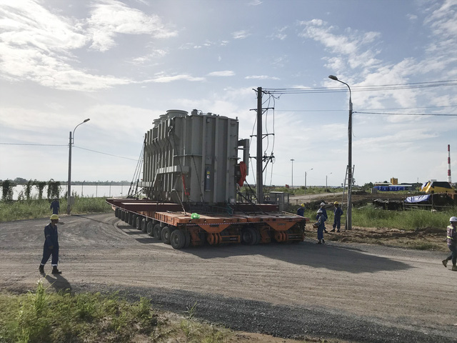 Với trọng lượng 335 tấn và kích thước dài 12,34m, rộng 4,5m và cao 5,6m, máy biến áp đã được Vietranstimex vận chuyển đến cảng công trường bằng đường sông. Sau khi được bốc xếp lên bờ, máy biến áp đã được vận chuyển vào bệ vận hành bằng rơ-mooc chuyên dụng tự hành.
